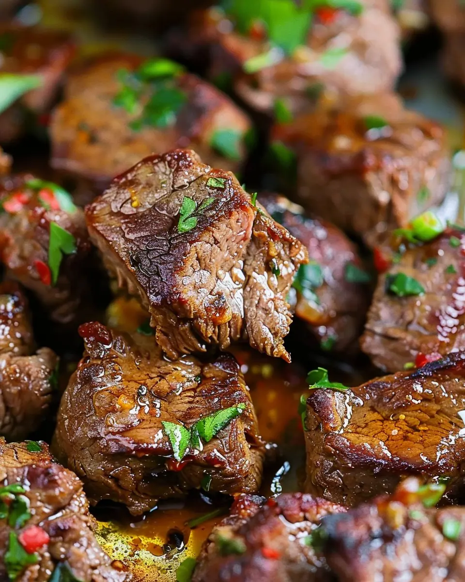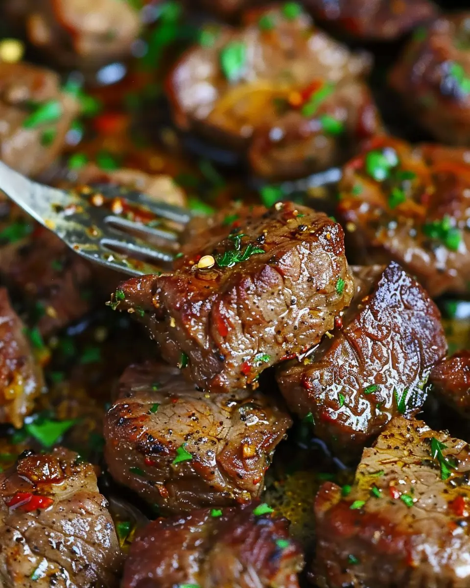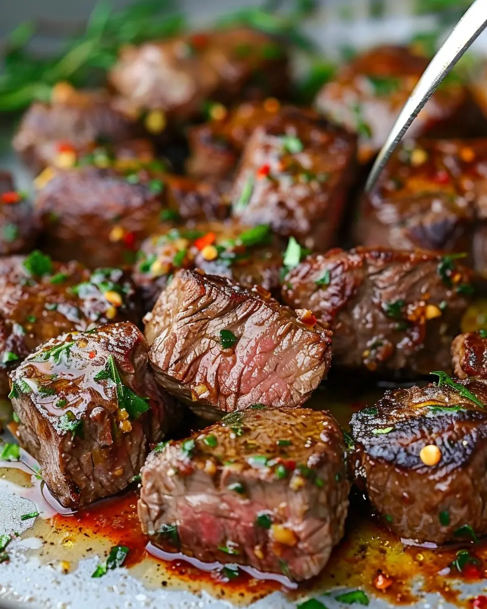 - Toss in Garlic Butter: Immediately transfer the hot steak bites to a bowl and drizzle them with the garlic butter. Toss gently to coat all the pieces.