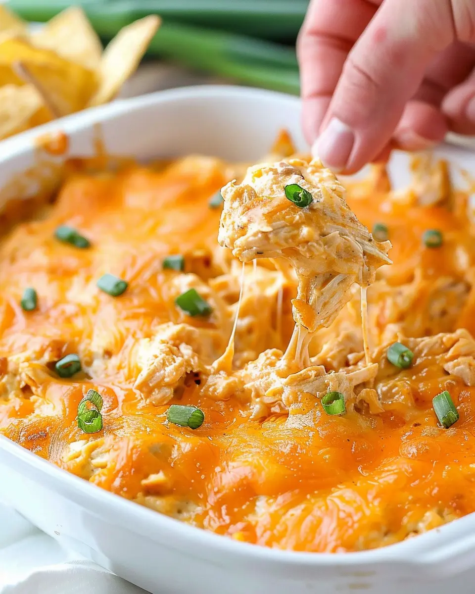 Once your Buffalo Chicken Dip is out of the oven and slightly cooled, it’s time to dress it up! Garnish with freshly chopped green onions for a pop of color and a bit of freshness. Depending on your crowd, you might also add some extra buffalo sauce on top for those who love it spicy!