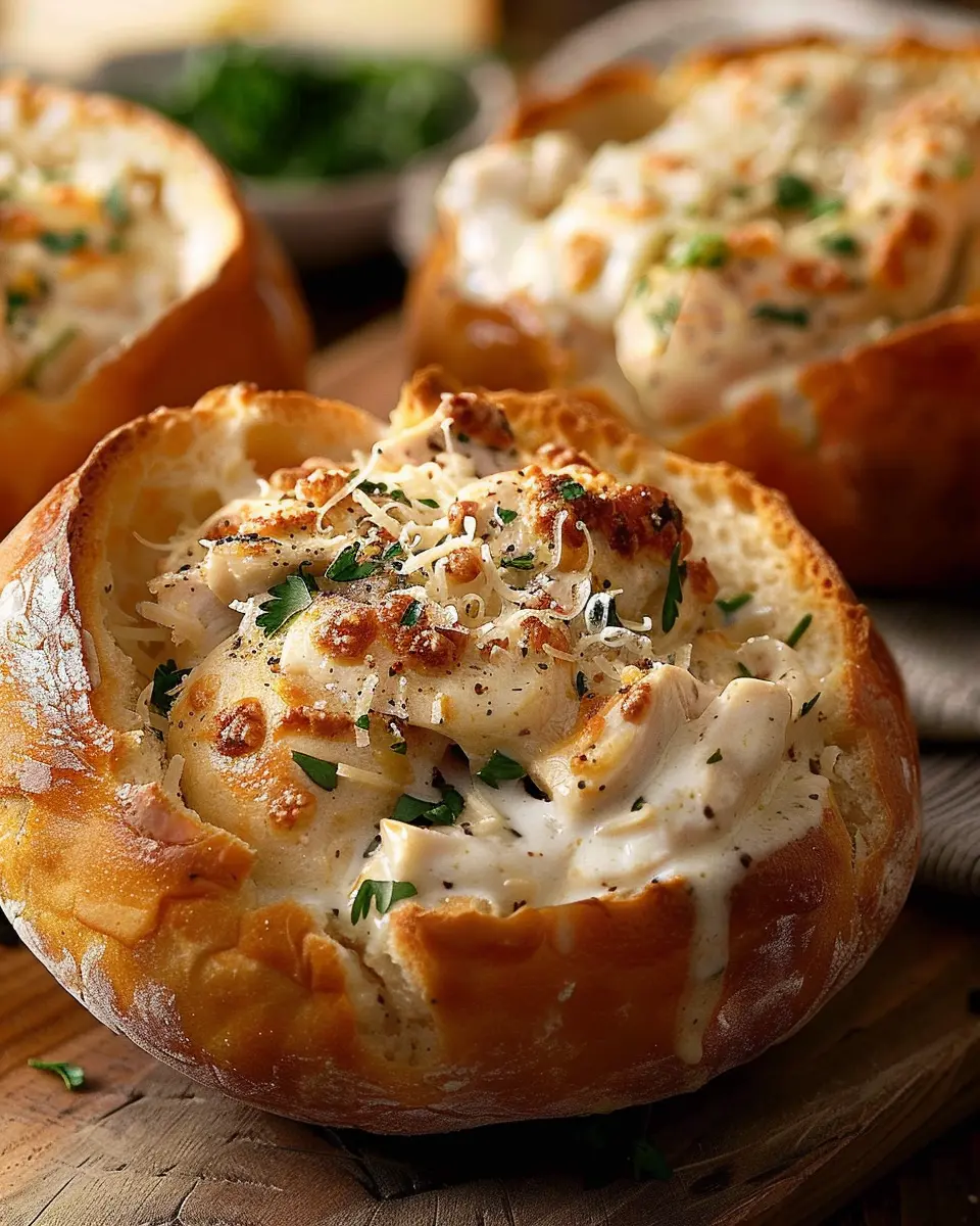 Indulge in the creamy, garlicky goodness of Chicken Alfredo served in a crispy bread bowl! This easy comfort food recipe is perfect for a family dinner or cozy night in.