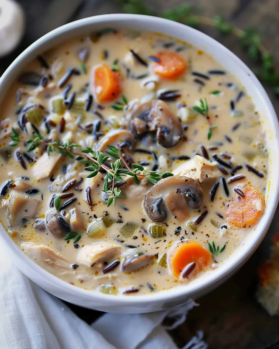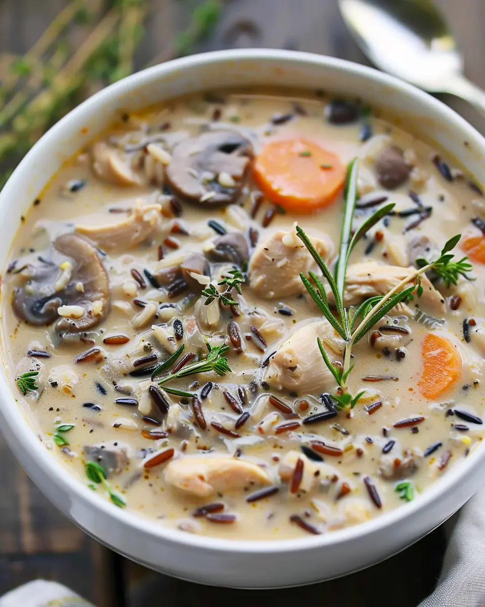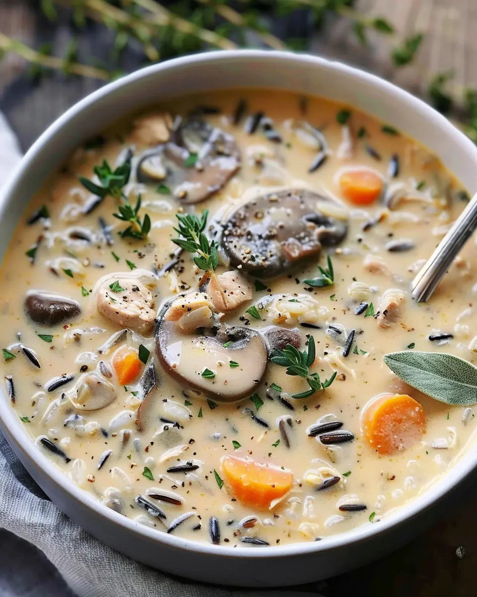 This creamy mushroom chicken and wild rice soup is the ultimate comfort bowl, combining tender chicken, earthy mushrooms, and wholesome wild rice in a rich, creamy base.