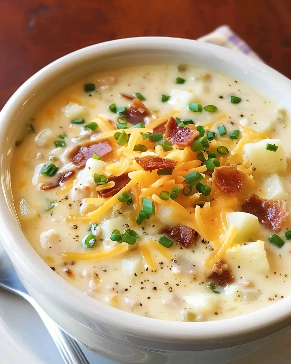 A warm and hearty crock pot potato soup recipe that features turkey bacon for a delicious twist on a classic comfort food.