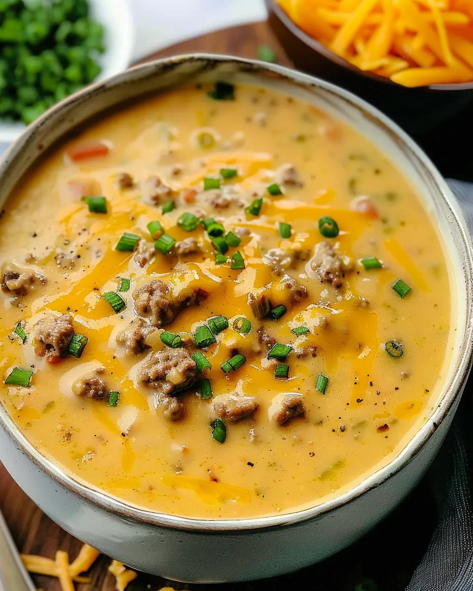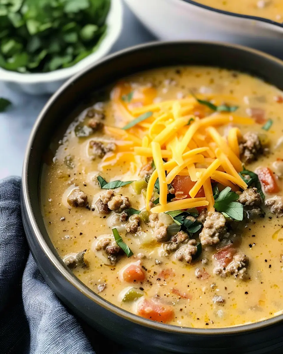 A rich and hearty cheeseburger soup featuring turkey bacon for a cozy twist.