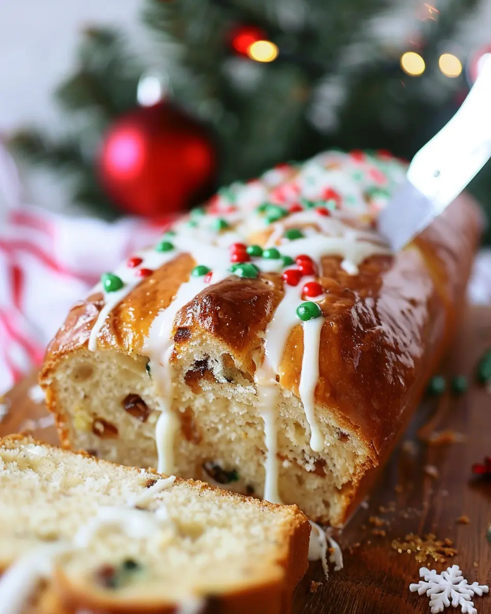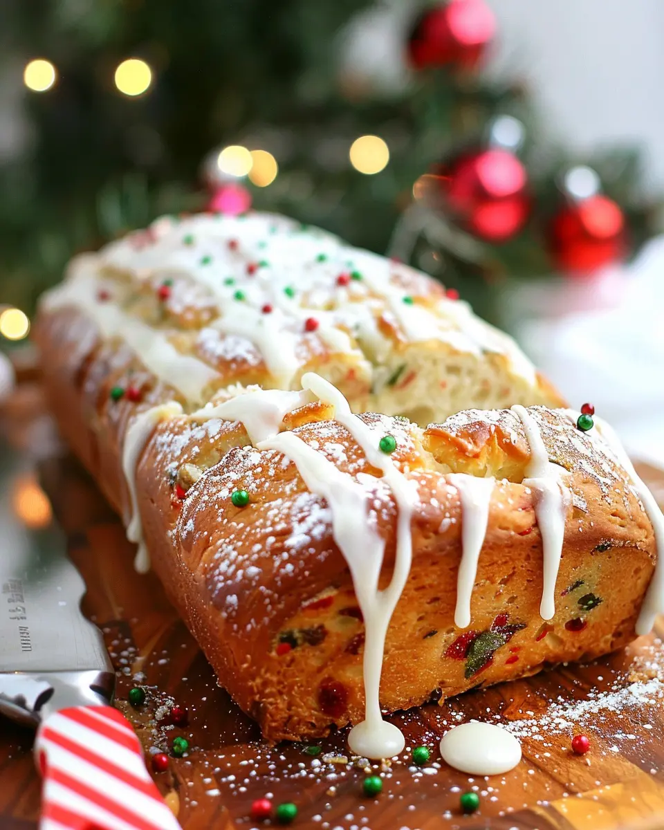 Mix together some powdered sugar and milk to create a light icing. Drizzle this over the cooled bread to add a sweet finishing touch. If you’re feeling extra festive, sprinkle on a few more colorful sprinkles for that eye-catching holiday flair.