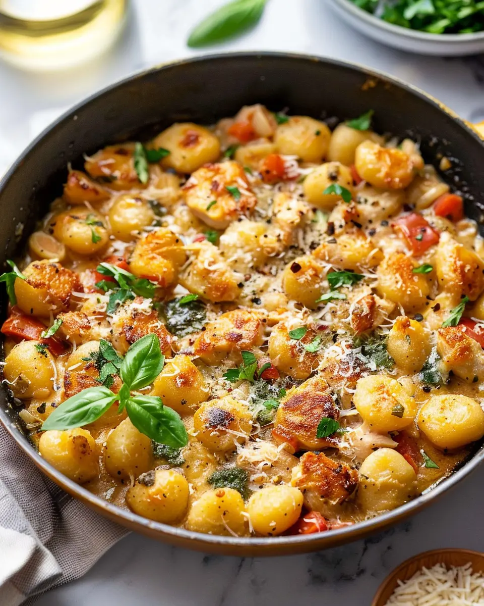 A delicious and easy-to-make meal combining chicken, gnocchi, and garlic in one skillet.