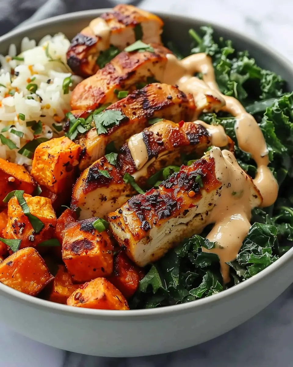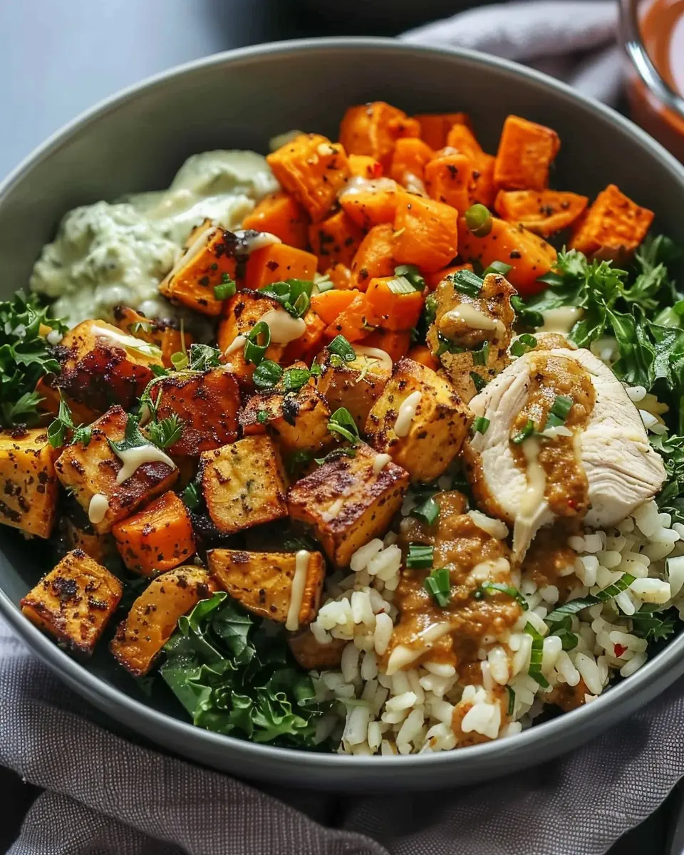 Balanced Nutrition: A balanced bowl typically includes proteins, whole grains, and plenty of vegetables, ensuring you get a variety of nutrients in one meal. For instance, this recipe combines brown rice for sustained energy, chicken for muscle support, and sweet potatoes for essential vitamins.