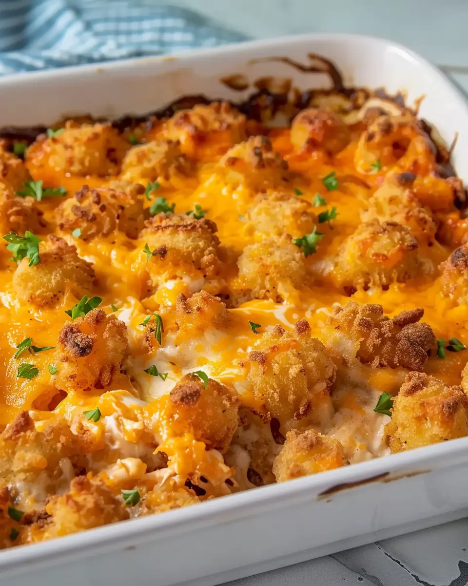 A delightful casserole featuring crispy tater tots, turkey bacon, and chicken ham.