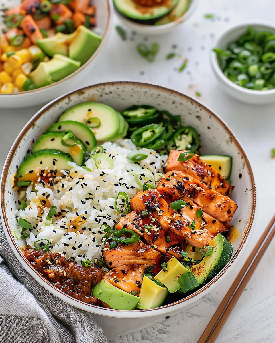 When it comes to beverages, consider serving your spicy salmon bowls with refreshing options like iced green tea or coconut water. For sides, a light cucumber salad or steamed broccoli complements the dish wonderfully. If you’re looking to indulge, a savory miso soup can be a comforting addition.