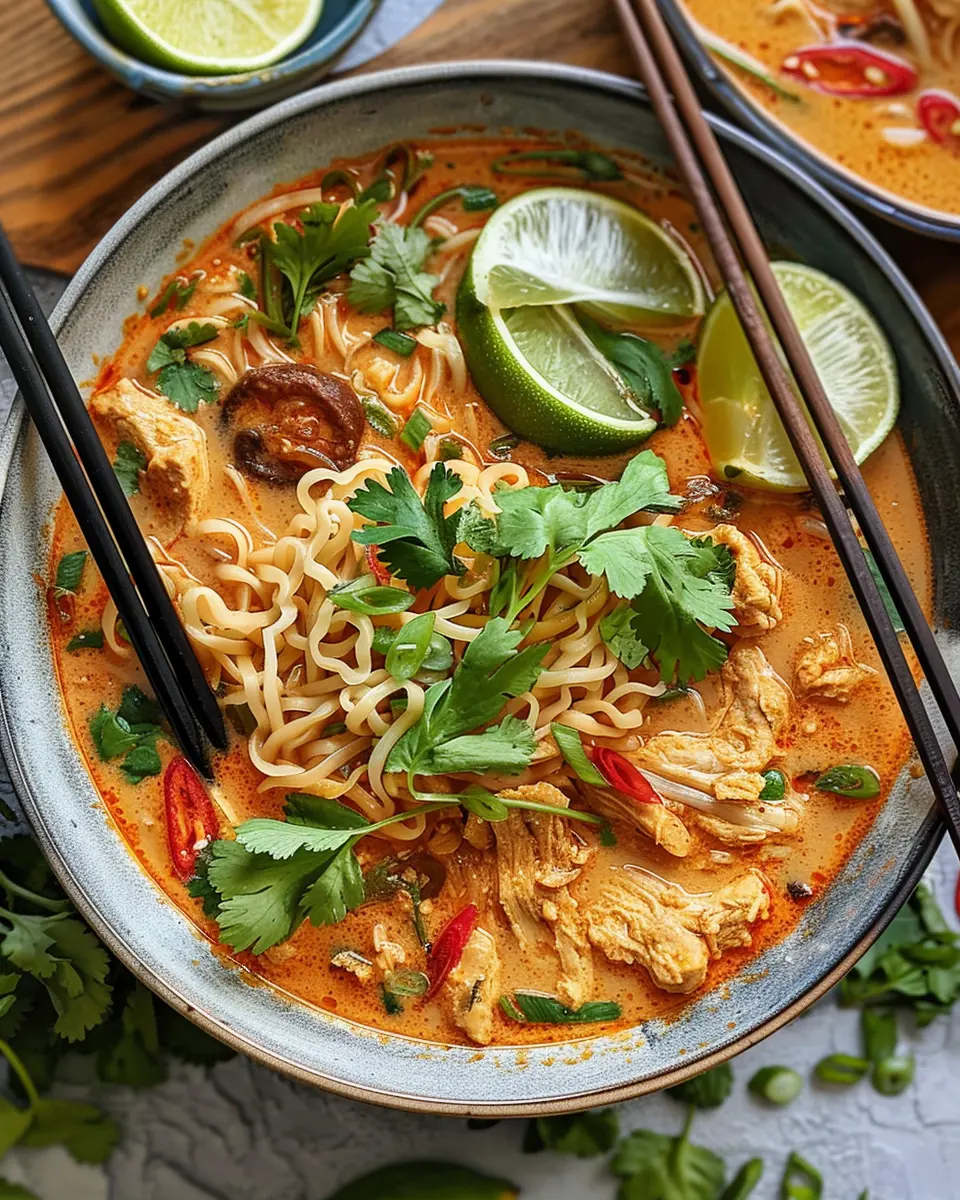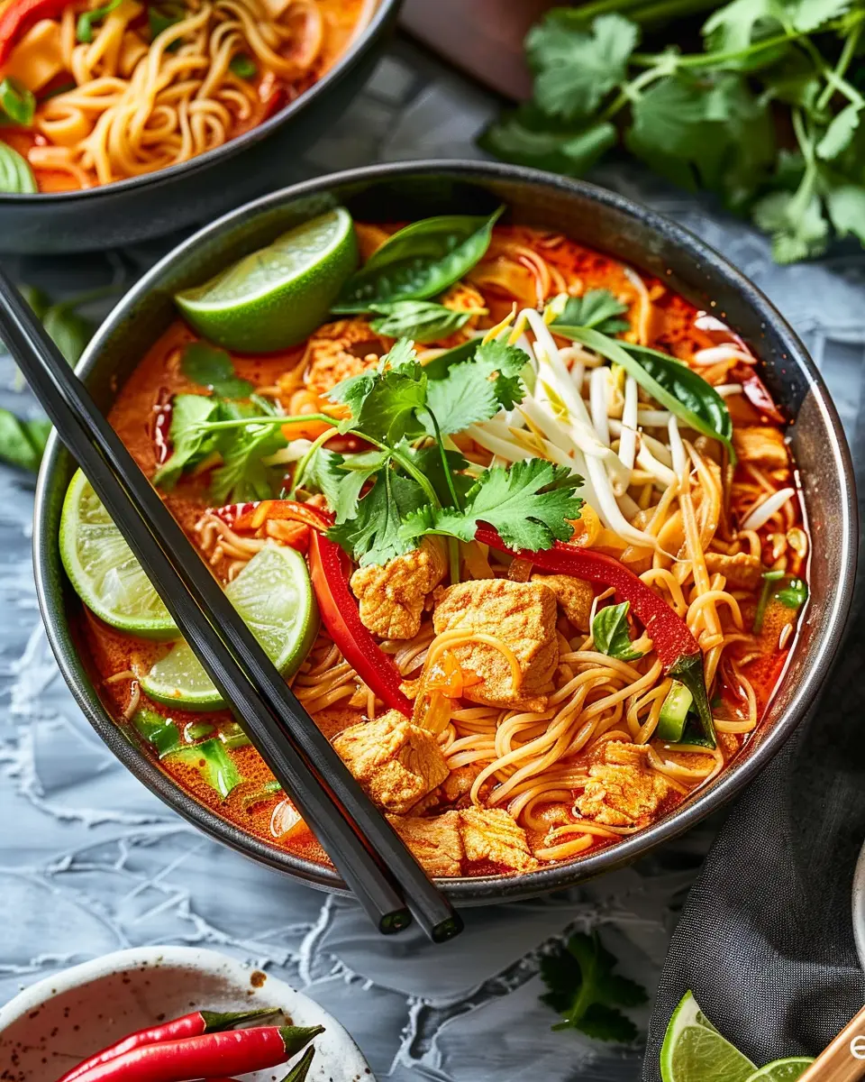 Your bowl of Thai Red Curry Noodle Soup is nearly ready to enjoy! Once the noodles are cooked to your liking, ladle the soup into bowls. Garnish each serving with fresh cilantro and a squeeze of lime juice. This brightens and balances the rich, creamy flavors—indeed, a must for that authentic taste!